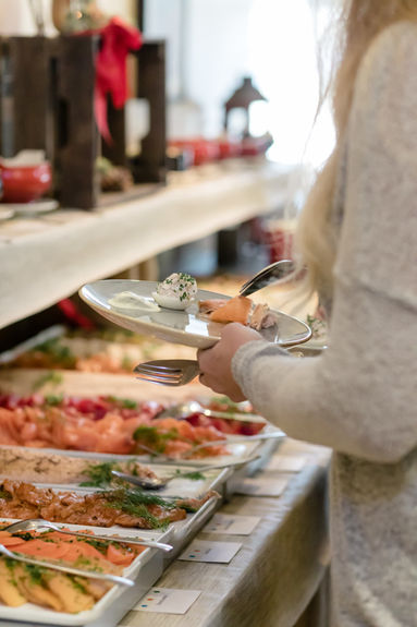 Vi rullar egna köttbullar och gravar den finaste laxen. Vi har omtyckta veganska alternativ och en uppskattad härlig dessertbuffé.